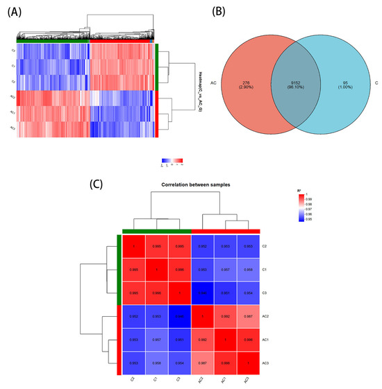 Identification of Differentially Expressed Genes (DEGs) under sodium acetate conditions in N. oceanica. (A) Heatmap analysis of DEGs across different treatments. Red indicates upregulation, while blue indicates downregulation. “AC” refers to the experimental group, and “C” refers to the control group. (B) Venn diagram comparing the experimental group (AC) with the control group (C). The numbers in the circles represent the total number and percentage of genes, while the overlapping regions show the number of common gene sequences between the experimental and control groups. (C) Correlation heatmap between samples. Red indicates high correlation, while blue indicates low correlation; “AC” is the experimental group and “C” is the control group.