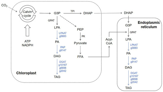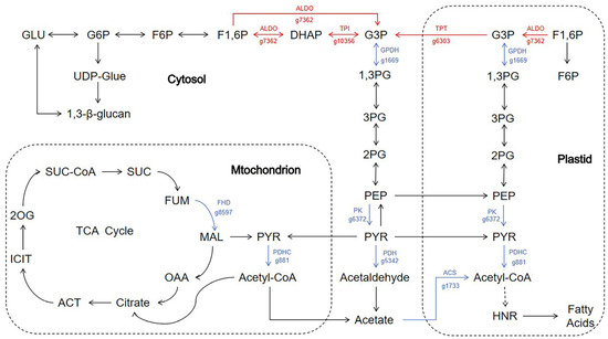Glycolysis is a primary pathway through which microalgae obtain energy [42]. Glyceraldehyde-3-phosphate (G3P), a key product of the Calvin cycle, is converted into pyruvate (a precursor for fatty acid biosynthesis) via the glycolysis pathway [43]. In the plastid, only the lower portion of the glycolysis pathway (from G3P to pyruvate) occurs, with the plastid fructose-1,6-bisphosphate aldolase (ALDO) catalyzing the conversion of fructose 1,6-bisphosphate (F1,6P) to G3P [44] (Figure 6). In the more upstream portion of the glycolytic pathway in the cytosol (from glucose to G3P) in N. oceanica, transcript levels of several G3P-related enzymes and transporters, including triosephosphate/phosphate translocator (TPT; g6303), fructose-1,6-bisphosphate aldolase (ALDO; g7362), and triphosphate isomerase (TPI; g10356), were all found to be upregulated to varying degrees (Figure 6 and Table 4). Specifically, TPT expression increased by 5.2-fold, ALDO by 7.9-fold, and TPI by 4.1-fold (Table 4). These results suggest that more G3P is being produced, which is beneficial for lipid production and aligns with previous findings to some extent [45]. Triosephosphate isomerase, also known as glyceraldehyde-3-phosphate dehydrogenase, is a well-known glycolytic enzyme that interconverts the 3-carbon sugar phosphates dihydroxyacetone (DHAP) and G3P. TPI is essential for the net production of ATP from DHAP catabolism and anaerobic glucose metabolism [46].