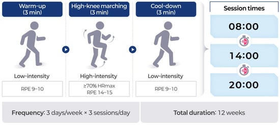 Participants assigned to the exercise snack group (ESG) performed a time-efficient, distributed physical activity regimen designed to elicit cardiovascular and metabolic benefits while accommodating the functional limitations common among older adults and cancer survivors. The selected protocol aligns with the operational definition of an “exercise snack,” which refers to short bouts of moderate-to-vigorous-intensity activity performed multiple times per day, allowing for accumulated physiological benefits without requiring long continuous sessions. This approach has been proposed as an effective and feasible strategy for improving health outcomes in populations with low exercise tolerance or limited time availability [17]. The intervention was conducted over 12 weeks, with participants completing three sessions per day, approximately 6 h apart (e.g., 08:00, 14:00, and 20:00), three days per week. Each session lasted a total of 9 min, consisting of a 3 min warm-up, a 3 min high-intensity bout, and a 3 min cool-down (Figure 1). The warm-up and cool-down phases involved low-intensity movements such as walking in place, performed at a self-perceived exertion of 9–10 on the Borg 6–20 scale. The high-intensity component, which served as the central stimulus of each session, consisted of high-knee marching in place. Participants were instructed to swing both arms vigorously in coordination with each knee lift, maintaining a full range of motion through the shoulders and elbows. The simultaneous engagement of the upper and lower limbs was intended to elevate heart rate response and metabolic demand, thereby maximizing the physiological stimulus of the high-knee exercise [37]. Participants were instructed to raise their knees to at least hip height and to maintain a cadence of 100 to 110 steps per minute [38]. A metronome application was used to ensure consistency of pace. Exercise intensity was individualized to target ≥ 70% of maximal heart rate (HRmax), calculated using the standard age-predicted formula (HRmax = 220 − age). RPE was also monitored using the Borg scale, with values between 14 and 15 reflecting vigorous-intensity effort. This intensity range was selected based on studies demonstrating the safety and efficacy of similar workloads in older adults [39]. In addition, participants were encouraged to adjust their effort within the prescribed repetition and intensity ranges to accommodate daily variations in physical capacity, ensuring that each exercise bout remained both challenging and achievable. The exercise snack protocol was implemented as a home-based intervention to promote accessibility and minimize logistical barriers. All participants received individualized in-person orientation sessions prior to program initiation, during which they were trained on proper exercise technique, use of the metronome app, and heart rate monitor operation. These sessions were delivered by certified exercise specialists trained in geriatric fitness. Participants performed the exercises at home and were provided with printed instructions and daily log sheets. To ensure compliance and safety, weekly check-ins were conducted remotely via phone or video calls by trained research staff. These calls included review of heart rate data, RPE values, and self-reported exercise logs. This hybrid structure allowed for effective delivery of a home-based regimen while maintaining fidelity to the intended intensity and structure of the protocol.