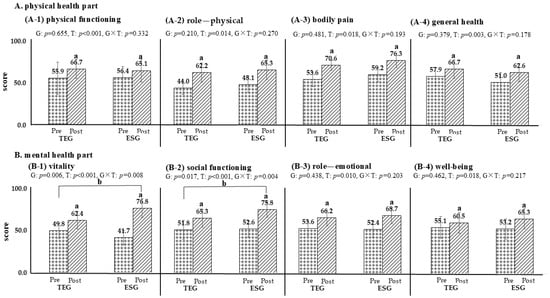 Comparison of changes in quality of life based on exercise groups (TEG, n = 17; ESG, n = 17). p < 0.05; a, pre-post comparison within the group; b, interactions based on time and groups; TEG, traditional exercise group; ESG, exercise snack group; G, group; T, time. The dot is Pre, the diagonal line is Post. (A-1) physical functioning; (A-2) role—physical; (A-3) bodily pain; (A-4) general health; (B-1) vitality; (B-2) social functioning; (B-3) role—emotional; (B-4) well-being.