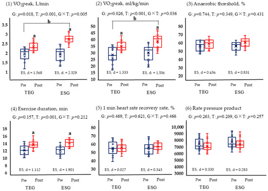 Comparison of changes in graded exercise test results based on exercise (TEG, n = 17; ESG, n = 17). p < 0.05; a, pre-post comparison within the group; b, interactions based on time and groups; TEG, traditional exercise group; ESG, exercise snack group; G, group; T, time. The blue is pre, the red is post. (1) VO2peak, L/min; (2) VO2peak, ml/kg/min; (3) Anaerobic threshold, %; (4) Exercise duration, min; (5) 1 min heart rate recovery rate, %; (6) Rate pressure product.