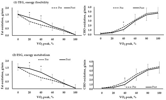 Figure 4 compared the fat and carbohydrate usage by exercise intensity (VO2 peak%) for each group pre and post. At low intensity, fat is mainly used, and as the intensity gradually increases, carbohydrate usage increases. The results showed that fat usage increased at 20% and 40% for both TEG and ESG (p < 0.05). Furthermore, carbohydrates significantly decreased at 40%. This means that efficiency increased by promoting fat oxidation (p < 0.05).