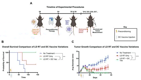 LD RT has proven to be effective in animal studies as a preconditioning regimen for cellular therapies [8,9]. We first tested whether adding LD RT preconditioning before DC tumor vaccine improved tumor rejection using a tumor model that is not rejected with tumor vaccine alone. The preconditioning regimen was tested on Kras;Trp53 (KP) pancreatic tumor cells expressing ovalbumin (KP Ova), injected into the flank. KP Ova, despite expressing the ova model antigen, which is capable of being recognized by T cells, is an “immune cold” tumor that is unresponsive to anti-PD-1 plus anti-CTLA4 immune checkpoint inhibition [18]. A radiation dose of 2 Gy was used for LD RT, since this dose is below definitive clinical doses for solid tumors and is well tolerated but still has cellular and immunomodulatory effects [8,9]. LD RT was administered to the mouse four days after subcutaneous tumor injection. Subsequently, Ova DCs were injected intravenously (IV) on days 5 and 8 (Figure 1A). LD RT alone led to growth reduction but did not eliminate tumors. When LD RT was followed by DC vaccine, all tumors were rejected, indicating that the addition of DC vaccine to LD RT improves tumor rejection and survival compared to LD RT alone (Figure 1B,C). Having established that the combination of LD RT with DC vaccine is more effective than LD RT alone, we next asked the reciprocal question—whether the combination of LD RT with DC vaccine is more effective than vaccine alone. Further, we asked whether an optimal preconditioning regimen exists among LD RT and two promising chemotherapy agents (cyclophosphamide and paclitaxel) that are also known to modulate the tumor microenvironment.