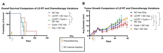 Although numbers of mice and clinical differences were relatively modest, the greatest benefit on long-term survival (surviving to day 107) and tumor growth was provided by the LD RT + DC vac group, which improved survival over groups treated with LD RT-cyclophosphamide + DC vaccine, cyclophosphamide + DC vaccine, and DC vaccine only (Figure 2A). Paclitaxel preconditioning led to significantly slower tumor growth but non-significantly improved survival over DC vaccine alone (63 days vs. 57 days, respectively) (Figure 2A,B). Cyclophosphamide preconditioning led to the worst overall survival and the fastest rate of tumor growth (Figure 2A,B); adding cyclophosphamide prior to DC tumor vaccine led to significantly faster tumor growth than DC tumor vaccine alone (Figure 2B). Additionally, adding cyclophosphamide to LD RT abrogated the benefit of LD RT (Figure 2A,B).