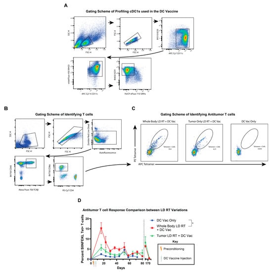 Cyclophosphamide (Cat. 13849, Cayman Chemical, Ann Arbor, MI, USA) was resuspended in PBS and injected at 250 mg/kg [15]. Paclitaxel (Cat. T7191, MilliporeSigma, Burlington, MA, USA) was titrated to 20 mg/kg [16] in 20% 50:50 Cremophor EL/ethanol, 80% saline. Both drugs were injected intraperitoneally. Both of these dosages have been chosen to model lymphodepletion in the mice before administration of the DC vaccine, which provides a basis of comparison between these chemotherapies and LD RT as preconditioning regimens.