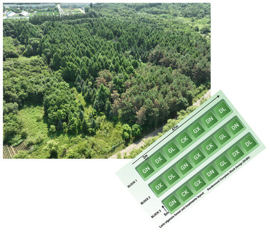 Schematic presentation of randomized complete block design field trial and plots of Larix olgensis forest soil with aerial view. GN: High-level urea treatment. DN: Low-level urea treatment. GL: High-level ammonium chloride treatment. DL: Low-level ammonium chloride treatment. GX: High-level sodium nitrate treatment. DX: Low-level sodium nitrate treatment. CK: Control treatment.