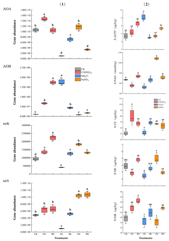 Subfigure (1) comprised detail of ammonia oxidiserz and denitrifiers abundance quantitatively measured by (qPCR) while subfigure (2) highlights the impact of different treatments used on soil enzymatic activities. Each different-colored box represents types of specific treatments applied, while horizontal line letters indicate treatments: CK as control, GN as high CO(NH2)2, DN as low CO(NH2)2, GL as high NH4+, DL as low NH4+, GX as high NO3− and DX as low NO3−, respectively. Similarly, S-NiR: soil nitrite reductase; S-NR: soil nitrate reductase; S-UE: soil urease; S-NAG: soil N-acetyl-β-d-glucosaminidase; S-ACPT: soil acid protease (as abbreviated). Among treatments, the same letter denotes non-significant effect.