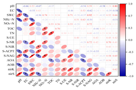 Correlation heat map of soil properties, enzymes activities and microbial gene abundances, shown in red for positive correlation and blue for negative correlation; * indicates p ≤ 0.05. S-NiR: soil nitrite reductase, EC: electrical conductivity, SWC: soil water content, TC: total carbon, TN: total nitrogen, S-NR: soil nitrate reductase, S-UE: soil urease, S-NAG: soil N-acetyl-β-d-glucosaminidase, S-ACPT: soil acid protease, AOA: ammonia oxidizing archaea, AOB: ammonia oxidizing bacteria (as abbreviated).