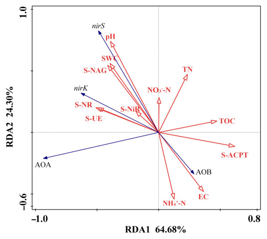 Redundancy analysis diagram of the abundance of functional genes and soil environmental factors. EC: electrical conductivity, SWC: soil water content, TOC: total organic carbon, TN: total nitrogen, S-NR: soil nitrate reductase, S-UE: soil urease, S-NAG: soil N-acetyl-β-d-glucosaminidase, S-ACPT: soil acid protease, AOA: ammonia oxidizing archaea, AOB: ammonia oxidizing bacteria (as abbreviated).