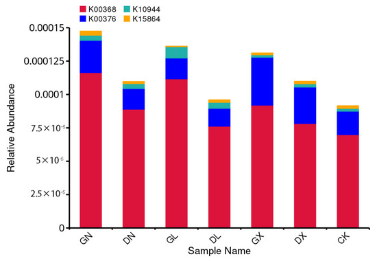 Forest soil nitrogen cycle microbial pathways are diverse and complex due to the involvement of different unknown microbial communities. Denitrifying genes nirK and nirS are among them. However, previous studies have shown that the nirS gene has a robust metabolic system and can conserve energy under stress conditions, while the nirK gene is independent in its role [43]. In order to understand denitrifying gene pathways or redundant roles under mineral nitrogen addition in L. olgensis forest soil, we analyzed shot-gun metagenome relative abundances. Relative abundances of genes’ metabolic pathways are shown in Figure 5.