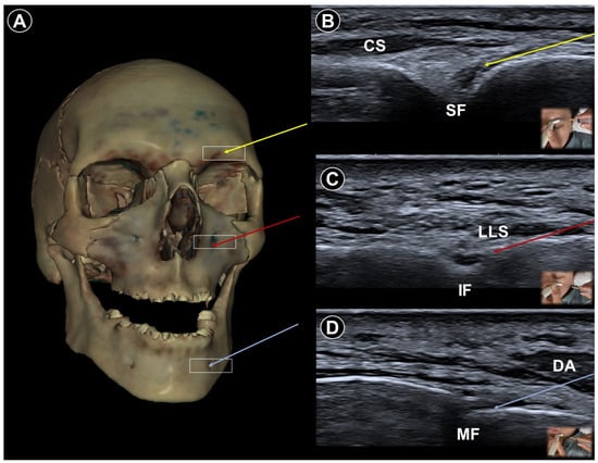 Cadaveric bony model reconstruction illustrating the supraorbital foramen (SF), infraorbital foramen (IF), and mental foramen (MF) (A), and ultrasound-guided injections targeting the supraorbital nerve (V1; needle trajectory indicated by the yellow arrow) (B), infraorbital nerve (V2; needle trajectory indicated by the red arrow) (C), and mental nerve (V3; needle trajectory indicated by the blue arrow) (D). CS, corrugator supercilii; LLS, levator labii superioris; DA, depressor anguli oris. The white square indicates the transducer footprint. Cadaveric images adapted from cadaveric images provided by the Visible Human Project® of the National Library of Medicine. Excerpts featured in the VH Dissector are used with permission from Touch of Life Technologies Inc. (Aurora, CO, USA).
