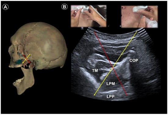For maxillary nerve blockade, the patient is placed in the lateral decubitus position with the affected side facing up. A curvilinear transducer is placed parallel to the zygomatic arch to visualize the lateral pterygoid muscle and the lateral pterygoid plate of the sphenoid bone (Figure 2A,B). Doppler imaging facilitates identification of the sphenopalatine artery. The needle is inserted using an out-of-plane approach to reach the pterygopalatine fossa. To access the mandibular nerve, the patient remains in the same lateral position. The needle is directed from anterior to posterior, targeting the space just posterior to the lateral pterygoid plate and between the medial and lateral pterygoid muscles (Figure 2A,B).