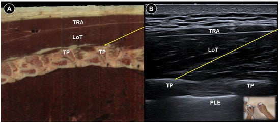 Cadaveric sagittal cross-sectional image (A), and corresponding ultrasound image (B), illustrating an ultrasound-guided erector spinae plane block, with the needle trajectory indicated by the yellow arrow. TRA, trapezius; LoT, longissimus thoracis; TP, transverse process; PLE, pleura. Cadaveric images adapted from cadaveric images provided by the Visible Human Project® of the National Library of Medicine. Excerpts featured in the VH Dissector are used with permission from Touch of Life Technologies Inc.