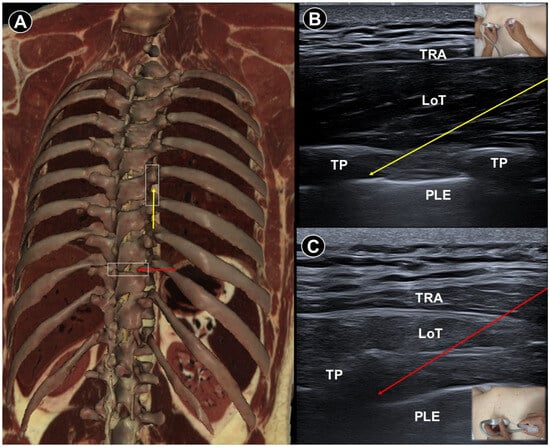 Cadaveric bony model reconstruction (A), and ultrasound images illustrating two approaches for paravertebral block: the parasagittal oblique approach (B) (needle trajectory indicated by the yellow arrow), and the transverse short-axis approach (C) (needle trajectory indicated by the red arrow). TRA, trapezius; LoT, longissimus thoracis; TP, transverse process; PLE, pleura. The white square indicates the transducer footprint. Cadaveric images adapted from cadaveric images provided by the Visible Human Project® of the National Library of Medicine. Excerpts featured in the VH Dissector are used with permission from Touch of Life Technologies Inc.
