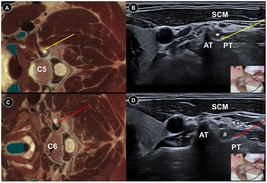 Cadaveric axial-sectional image (A), and corresponding ultrasound image (B), illustrating ultrasound-guided injection of the C5 nerve root (asterisk), with the needle trajectory indicated by the yellow arrow. Cadaveric axial-sectional image (C), and corresponding ultrasound image (D), illustrating ultrasound-guided injection of the C6 nerve root (hashtag), with the needle trajectory indicated by the red arrow. AT, anterior tubercle; PT, posterior tubercle; SCM, sternocleidomastoid.