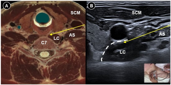 Cadaveric axial-sectional image (A), and corresponding ultrasound image (B), illustrating ultrasound-guided stellate ganglion block. The needle trajectory (yellow arrow) targets the region deep to the prevertebral fascia (dashed white line) overlying the longus colli (LC) muscle. AS, anterior scalene; SCM, sternocleidomastoid.