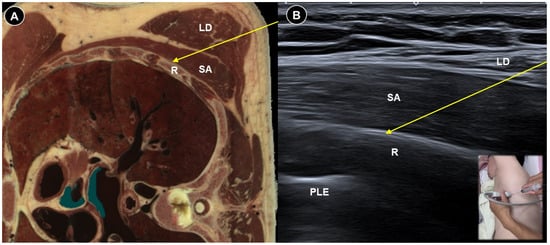 Cadaveric axial-sectional image (A), and corresponding ultrasound image (B), illustrating an ultrasound-guided serratus anterior (SA) plane block, with the needle trajectory indicated by the yellow arrow. LD, latissimus dorsi; R, rib; PLE, pleura. Cadaveric images adapted from cadaveric images provided by the Visible Human Project® of the National Library of Medicine. Excerpts featured in the VH Dissector are used with permission from Touch of Life Technologies Inc.