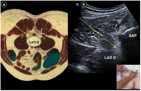 Cadaveric axial-sectional image (A), and corresponding ultrasound image (B), illustrating an ultrasound-guided lumbar plexus block, with the needle trajectory indicated by the yellow arrow. SAP, superior articular process; L4/5 D, intervertebral disc between L4 and L5. Cadaveric images adapted from cadaveric images provided by the Visible Human Project® of the National Library of Medicine. Excerpts featured in the VH Dissector are used with permission from Touch of Life Technologies Inc.