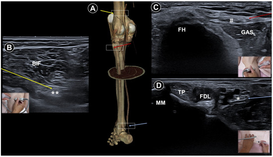 Diabetes is the leading cause of peripheral neuropathy, with most patients developing this complication over time. The most prevalent form is distal symmetrical polyneuropathy, characterized by progressive sensory loss starting from the distal lower extremities, although other patterns may also occur [56]. Management focuses on glycemic control and symptomatic pain relief. Lumbar plexus block (Figure 8A,B) using botulinum toxin type A [33] yielded significant relief of severe diabetic leg pain for four months. For patients with refractory painful distal symmetrical polyneuropathy, ultrasound-guided PRF of the stellate ganglion has been reported to show clinical benefits. In one study, the effective pain relief rates (≥50% reduction in pain) were 67.86%, 42.86%, 21.43%, and 17.86% at 1, 4, 12, and 24 weeks post-treatment, respectively, [57]. Hu et al. [58] employed an innovative ultrasound-guided hydrodissection approach. The procedure was carried out at multiple sites, including the bifurcation of the tibial and fibular nerves (Figure 9A,B), the peroneal nerve at the fibular head (Figure 9A,C), and the tibial nerve at the medial malleolus (Figure 9A,D). They proposed that this technique could release nerve adhesions and boost venous and lymphatic outflow, thereby alleviating paresthesia and pain. Pain improved in all five patients.