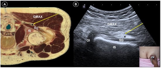 Cadaveric axial-sectional image (A), and corresponding ultrasound image (B), illustrating an ultrasound-guided sciatic nerve (asterisk) block, with the needle trajectory indicated by the yellow arrow. GMAX, gluteus maximus; SG, superior gemellus; OI, obturator internus; IS, ischium. Cadaveric images adapted from cadaveric images provided by the Visible Human Project® of the National Library of Medicine. Excerpts featured in the VH Dissector are used with permission from Touch of Life Technologies Inc.