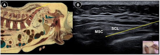 Cadaveric sagittal section (A), and corresponding ultrasound image (B), illustrating a caudal block, with the needle trajectory indicated by the yellow arrow. MSC, median sacral crest; SCL, sacrococcygeal ligament. Cadaveric images adapted from cadaveric images provided by the Visible Human Project® of the National Library of Medicine. Excerpts featured in the VH Dissector are used with permission from Touch of Life Technologies Inc.