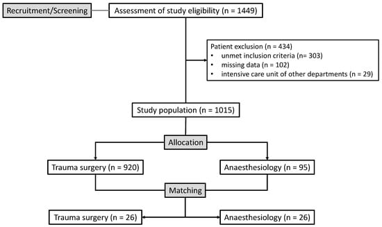 The Department of Trauma Surgery leads the shock room in the emergency department. Since our Level 1 Trauma Center primarily maintains a trauma surgery ICU, polytrauma patients are preferentially transferred to the trauma ICU. When the trauma ICU reaches capacity, severely injured patients are admitted to the anesthesiology ICU. This allocation procedure was maintained consistently throughout the study period but may have introduced potential selection bias, which we addressed through the rigorous matching procedures described below.