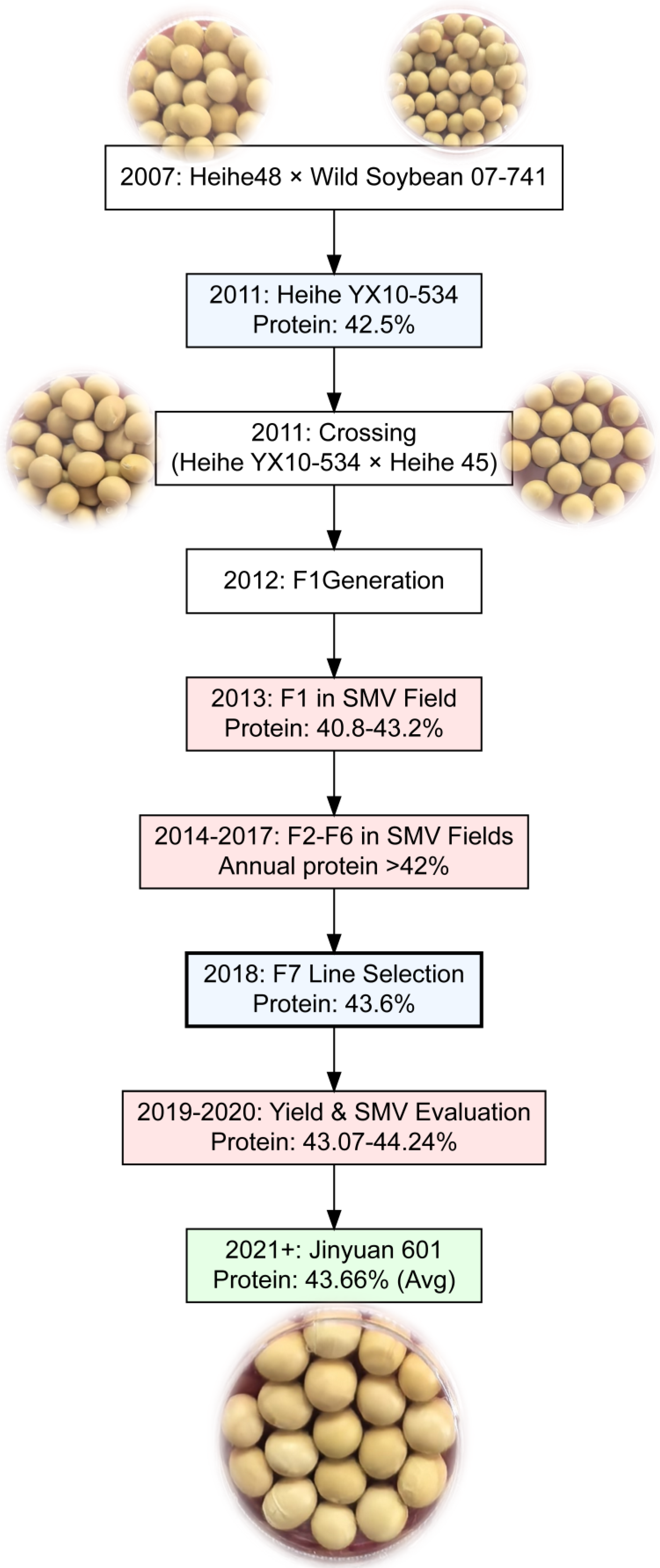 The breeding process began in 2007 with the creation of an intermediate parent, Heihe YX10-534, derived from a cross between the cultivated variety Heihe 48 and the wild soybean accession 07-741 (Figure 1). This parental line was selected for its high protein content (42.5%) and resistance to Soybean Mosaic Virus (SMV), as confirmed through systematic screening. In 2011, Heihe YX10-534 was crossed with Heihe 45 (a progeny of Beifeng No. 11 × Heihe No. 26) to combine high-protein traits with agronomic stability. The F1 generation (2012) was grown under controlled conditions, and pseudo-hybrids were eliminated. From 2013 to 2017, the population was advanced from F2 to F6 generations using the single-seed descent method under SMV-infested field conditions (Figure 1). Rigorous selection was applied for protein content (consistently greater than 42%) and SMV resistance, with protein levels quantified annually using near-infrared spectroscopy (NIRS). By 2018, the F7 generation had yielded the stable line Heihe 18-250, which exhibited a protein content of 43.6%. From 2019 to 2020, the line underwent yield trials and repeated SMV resistance evaluations, demonstrating protein levels of 43.07–44.24% and stable agronomic performance. The cultivar, later designated as Jinyuan 601, maintained an average protein content of 43.66% in subsequent multi-environment trials conducted from 2021 onwards (Figure 1).