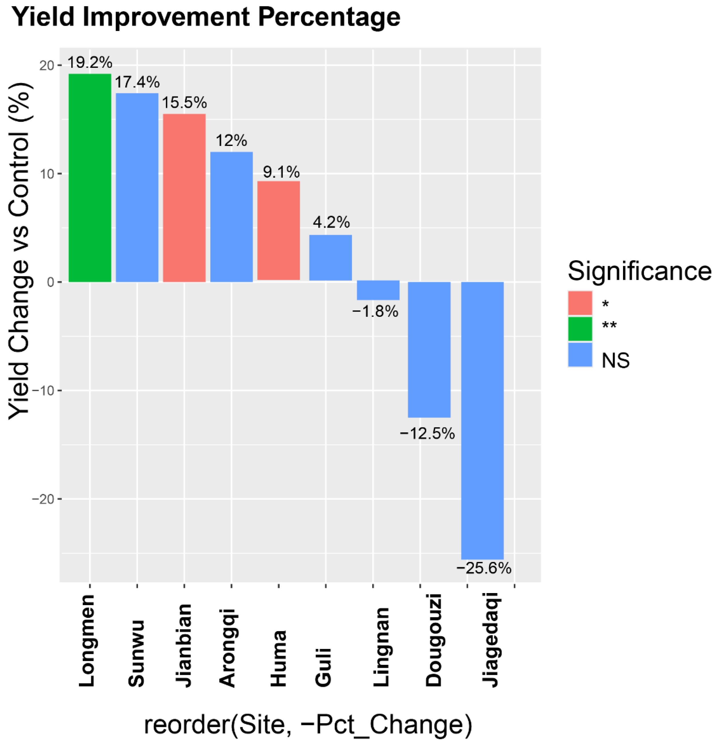 Figure 2. Yield change (%) of Jinyuan 601 relative to Huajiang No. 2 across test locations.
