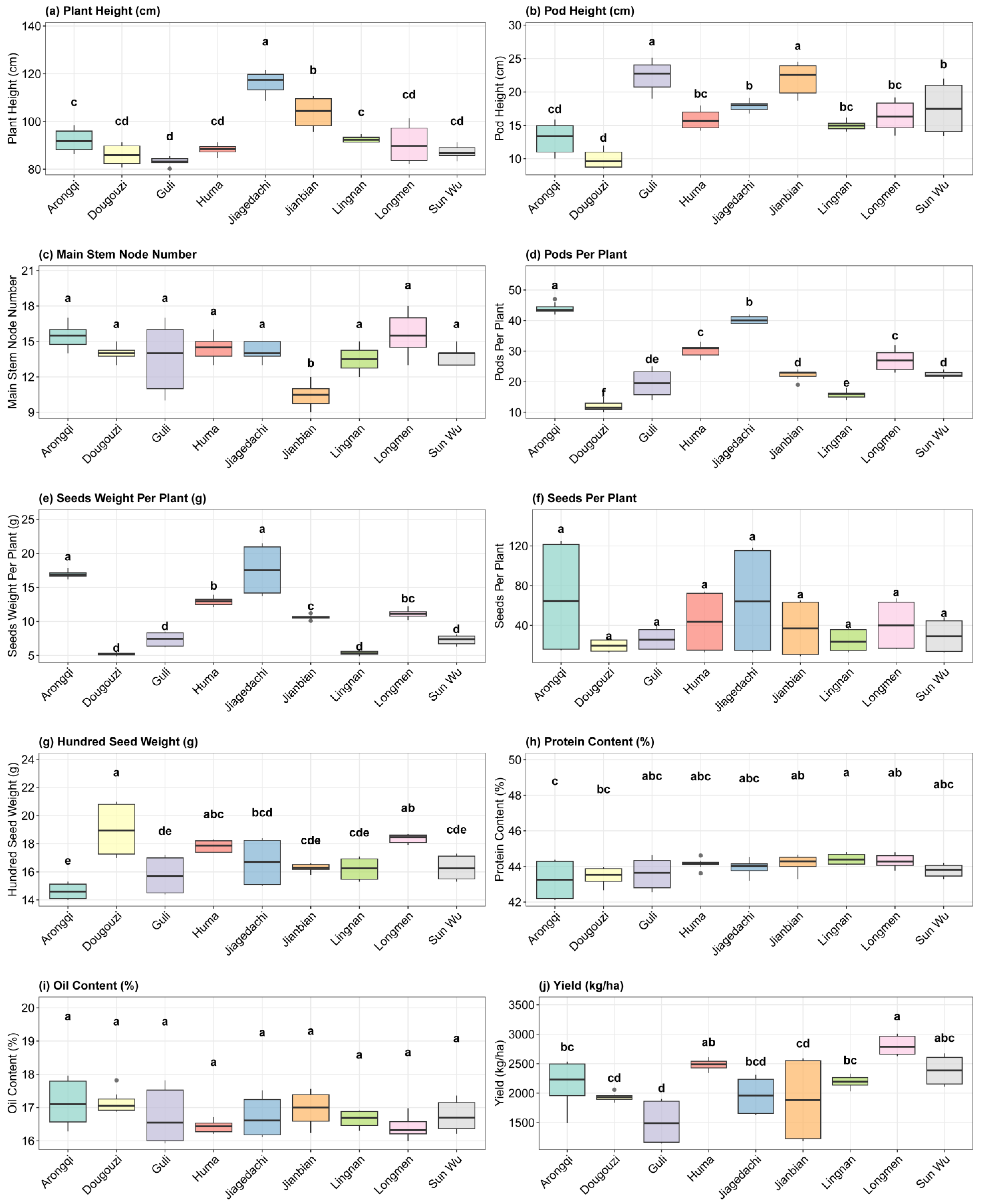 Figure 3. Variation in agronomic traits and seed quality parameters of Jinyuan 601 soybean cultivar across nine geographical locations. (a) Plant height (PH), (b) Pod height (PODH), (c) Main stem node number (MSNN), (d) Pods per plant, (e) Seed weight per plant, (f) Seeds per plant, (g) 100-seed weight (HSW), (h) Protein content, (i) Oil content, and (j) Yield performance. Data represent the mean ± standard deviation (n = 3). Locations are listed from left to right in order of increasing latitude. Different letters above bars indicate significant differences among locations within each parameter (p < 0.05). The dots above bars indicate the maximum and minimum value.