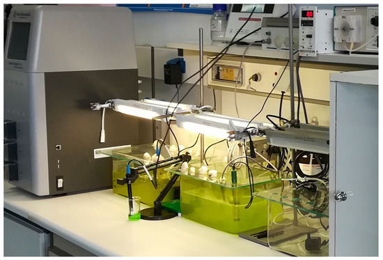 As depicted in Figure 1, three Τ5, 8 W, 6500 Κ fluorescent lamps placed above the surface of the culture provided a continuous illumination of 232 μE/m2·s. Preliminary experiments were also carried out under the same light intensity, but with the application of a 16:8 (h, light/dark) photoperiod (see Supplementary Material). Except for the practical restrictions of the used set-ups, the selection of the aforementioned light intensity was based on the fact that most green microalgae thrive within the range of 50–400 μE/m2·s for balanced growth and photosynthetic activity.