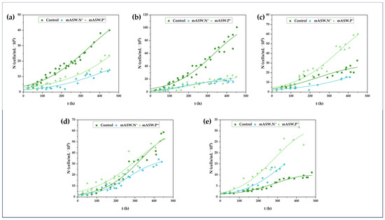 Growth curves of (a) Picochlorum costavermella VAS2.5, (b) Picochlorum oklahomense PAT3.2B, (c) Picochlorum oklahomense SAG4.4, (d) Microchloropsis gaditana VON5.3, (e) Nephroselmis pyriformis PAT2.7 cultured in modified Artificial Seawater (mASW) (control) and other variations in the growth medium under nutrient limitation in an Open Pond Simulating Reactor (OPSR) of 8.7 L (Vw = 5 L) capacity (two biological replicates). Each point is an average of two measurements and the curves were obtained by fitting the Verhulst model to the experimental data. In the legend of each graph the different culture conditions are denoted.
