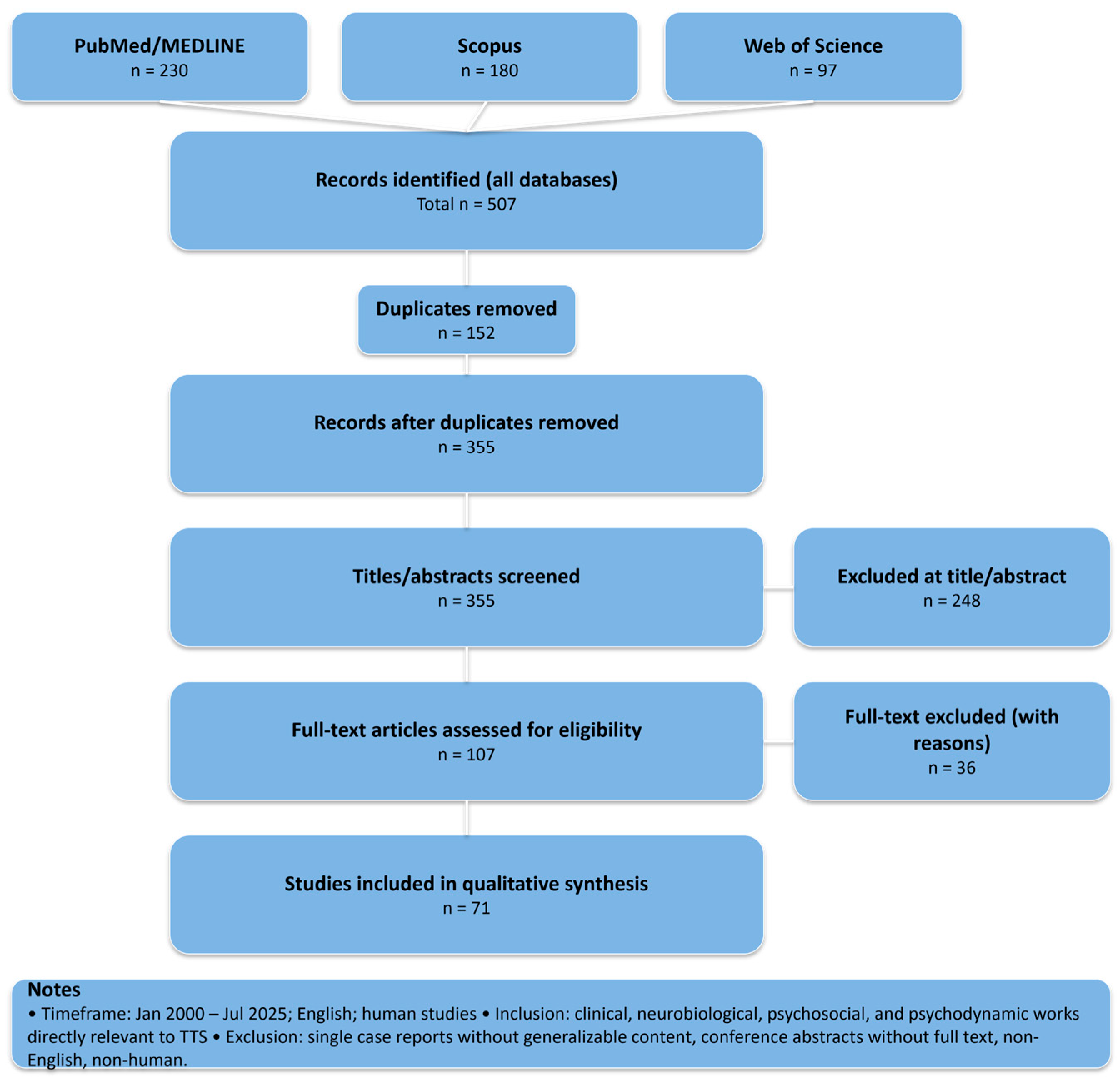 We included peer-reviewed articles in English focusing on clinical studies, meta-analyses, or systematic reviews of TTS with data on sex/gender differences; studies on neuroendocrine, autonomic, psychosocial, or psychiatric aspects of TTS; research or theoretical works connecting TTS to emotional regulation or psychoanalytic constructs. Exclusion criteria were case reports without broader clinical discussion; conference abstracts without full-text availability. Data was extracted on study design, population characteristics, key findings on gender differences, neurobiological correlates, psychosocial triggers, psychiatric comorbidities, and psychoanalytic interpretations. Findings were narratively synthesized to identify recurrent patterns, gaps, and integrative models. To enhance transparency in this narrative review, we report a simplified PRISMA flow (Figure 1).