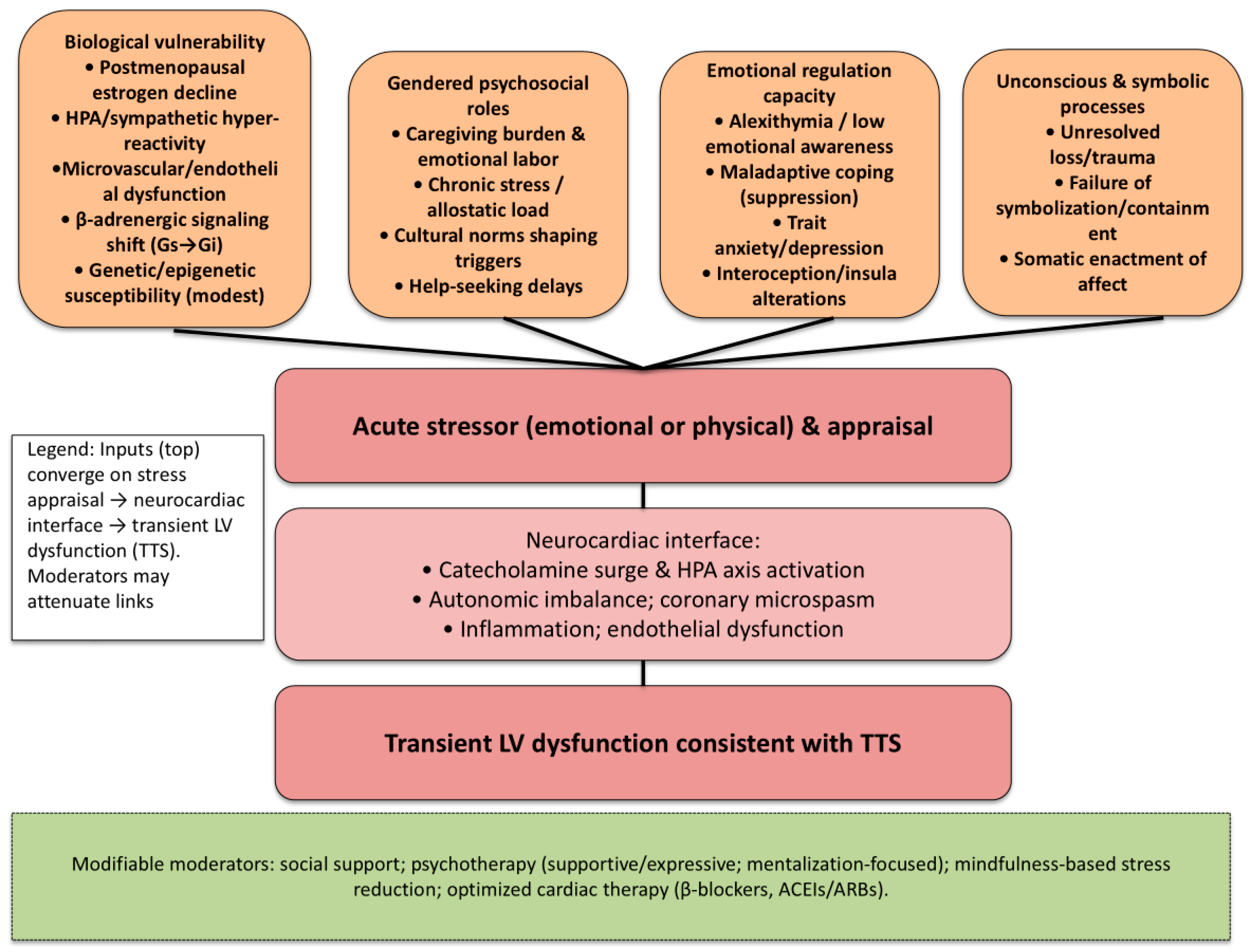 Figure 2. Integrative psychobiological model of Takotsubo Syndrome (TTS). Note: Upstream inputs: (1) biological vulnerability (postmenopausal estrogen decline; HPA/sympathetic hyper-reactivity; microvascular/endothelial dysfunction; β-adrenergic signaling shift; modest genetic/epigenetic susceptibility), (2) gendered psychosocial roles (caregiving burden, chronic stress/allostatic load, cultural norms, help-seeking delays), (3) emotional-regulation capacity (alexithymia, suppression, trait anxiety/depression, interoception/insula alterations), and (4) unconscious/symbolic processes (unresolved loss/trauma, failure of symbolization/containment, somatic enactment) converge on acute stressor appraisal. Directional arrows indicate the flow from appraisal to the neurocardiac interface (catecholamine surge and HPA activation; autonomic imbalance; coronary microspasm; inflammation/endothelial dysfunction), ultimately resulting in transient LV dysfunction typical of TTS. A dashed box highlights modifiable moderators (social support; psychotherapy—supportive/expressive, mentalization-focused; mindfulness-based stress reduction; optimized cardiac therapy with β-blockers and ACEIs/ARBs) that may attenuate multiple links along the pathway. Abbreviations: TTS, Takotsubo syndrome; HPA, hypothalamic–pituitary–adrenal (axis); LV, left ventricular; β-adrenergic, beta-adrenergic; β-blockers, beta-adrenergic blockers; ACEIs, angiotensin-converting enzyme inhibitors; ARBs, angiotensin II receptor blockers; Gs/Gi, stimulatory/inhibitory G-protein.