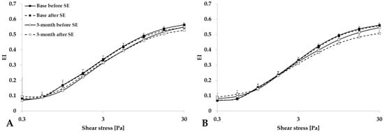 Elongation index (EI)–shear stress (SS) curves for the Control group (A) and Training group (B), tested before and after spiroergometry (SE), with test conducted at the beginning of the program (base) and at the end of the 3-month program. Means ± S.D.