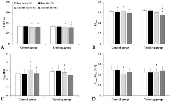 Elongation index (EI) at 3 Pa (A), EImax (B), shear stress at half EImax (SS1/2) (C), and their ratio (D) in the Control and Training groups, tested before and after spiroergometry (SE), with tests conducted at the beginning of the program (base) and at the end of the 3-month program. Means ± S.D.; * p < 0.05 vs. before spiroergometry; # p < 0.05 vs. base, + p < 0.05 vs. Control.