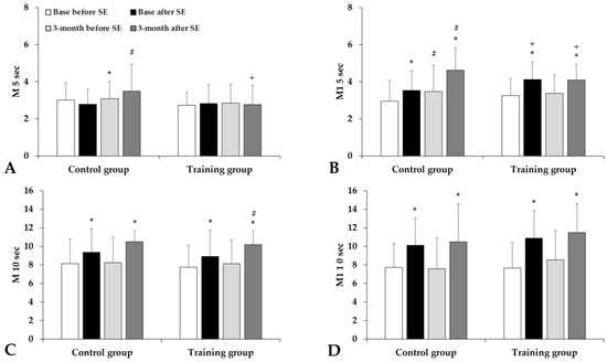 Aggregation index values by light-transmission method: M 5 sec (A), M1 5 sec (B), M 10 sec (C), and M1 10 sec (D) in the Control and Training groups, tested before and after spiroergometry (SE), with tests conducted at the beginning of the program (base) and at the end of the 3-month program. Means ± S.D.; * p < 0.05 vs. before spiroergometry; # p < 0.05 vs. base, + p < 0.05 vs. Control.