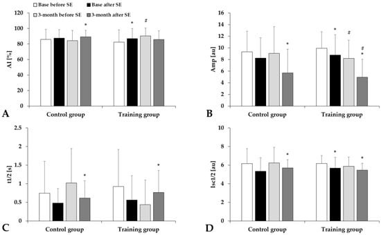 Aggregation index values by syllectometry method: AI (A), Amp (B), t1/2 (C), and Isc1/2 (D) in the Control and Training groups, tested before and after spiroergometry (SE), with tests conducted at the beginning of the program (base) and at the end of the 3-month program. Means ± S.D.; * p < 0.05 vs. before spiroergometry, # p < 0.05 vs. base.