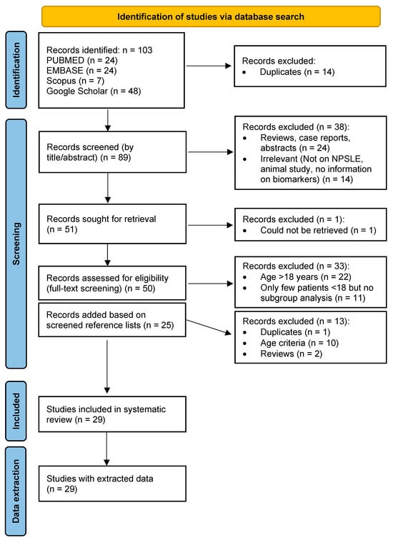 We followed the PRISMA guidelines to perform a systematic literature search of articles relevant to pediatric NPSLE and biomarkers in four databases: PubMed, Scopus, Embase, and Google Scholar. The protocol of the review was registered in the Open Science Framework (https://doi.org/10.17605/OSF.IO/TKBP2, accessed on 14 September 2025). A comprehensive search strategy was developed for each database and customized based on the database’s requirements. We used appropriate search terms that included combinations of MeSH terms and free-text keywords. A sample search string for PubMed was as follows: (neuropsychiatric lupus OR neuropsychiatric systemic lupus erythematosus OR NPSLE) AND (biomarkers OR autoantibodies OR cytokines OR chemokines OR complement OR neurofilament light chain OR cerebrospinal fluid biomarkers) AND (pediatric OR child OR adolescent OR juvenile) AND (diagnosis OR prognosis). The search was conducted from inception to June 2025, and the following limits were already applied at the time of the database search: language: English; species: humans; age: <18; study type: exclude case reports. Additional studies were identified by reviewing the reference lists of relevant articles.
