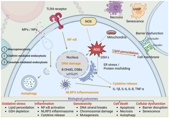 MPs/NPs contact the epithelium and enter via macropinocytosis, clathrin- and caveolae-mediated endocytosis. Recognition (e.g., Toll-like receptor (TLR)4) and NOX activation together with mitochondrial dysfunction elevate ROS, driving lipid peroxidation and GSH depletion. In parallel, ER stress/protein misfolding develops. ROS and lysosomal stress activate NF-κB and assemble the NLRP3 inflammasome, triggering cytokine release (IL-1β, IL-6, IL-8, TNF-α). Nuclear injury includes 8-OHdG(8-hydroxy-2’-deoxyguanosine) and γ-H2AX-marked double-strand breaks (DSBs). Disruption of tight-junction proteins (occludin, claudin) causes barrier dysfunction. These pathways lead to oxidative stress, inflammation, genotoxicity, cellular dysfunction (including senescence/senescence-associated secretory phenotype (SASP) and barrier disruption), and cell death (apoptosis, necrosis, autophagy).
