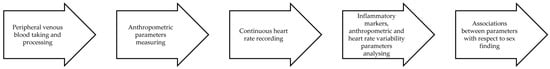 Under physiological conditions, the ANS is strongly involved in different mechanisms of the cardiovascular system activity. The generally accepted and validated marker of this autonomic function is heart rate variability (HRV), i.e., continuous “beat-to-beat” oscillations of heart rate around its mean values, indicating a healthy and adaptive organism []. Therefore, HRV analysis represents a valuable non-invasive tool for the detection of discrete abnormalities in cardiac autonomic regulation. The short-term HRV is routinely analyzed by a linear (spectral) method quantifying the high-frequency component that primarily reflects parasympathetic (vagal) activity and the low-frequency components mediated by both parasympathetic and sympathetic inputs []. Given the physiological relation between inflammatory processes and predominantly vagal activity via the cholinergic anti-inflammatory pathway, the higher vagally mediated HRV is expected to be associated with decreased levels of inflammation. Although predominant findings support this idea in healthy adults as well as patients with cardiovascular disease, several studies have also reported a positive association between HRV indices and inflammatory markers []. Data on the relationships between inflammatory markers and HRV in the adolescent population are almost non-existent. In this context, a recent study found that resting HRV moderated interpersonal stress–inflammation associations only among adolescents with low resting HRV; however, this significant HRV moderation disappeared after multiple-testing correction [].