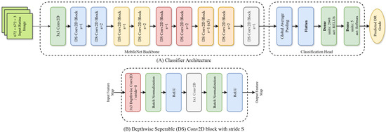 Architecture of our U-net-based segmentation model with the MobileNet encoder and a customized decoder. Here, (A): overall segmentation model architecture; (B): a single upsampling block.