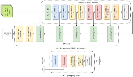 We trained a total of six segmentation models: four for segmenting lesions (MA, EX, HE, SE) and two for segmenting the optic disc and the macula. Our segmentation models were based on the U-Net [79] architecture. It had a MobileNet [78] encoder and a customized decoder (see Figure 2A). The MobileNet encoder was pretrained on the ImageNet-1k dataset. The customized decoder had five Upsampling blocks (Figure 2B). Each block contained an UpSampling2D layer, a concatenation layer, a Depthwise Separable Conv2D block ( Depthwise Convolution, Batch Normalization, LeakyReLU), a Conv2D block ( Convolution, Batch Normalization, LeakyReLU), and a Spatial Dropout2D layer with a rate of 10%. The output of the last Upsampling blocks was passed to another Conv2D block, and the output layer was a pointwise convolution layer with softmax activation.