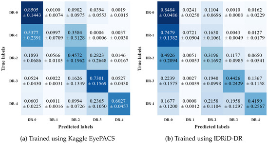 Confusion matrices of our ADRCs evaluated on the Kaggle EyePACS, IDRiD, and Messidor-2 datasets. Each subfigure shows mean ± std over each class of the three datasets.