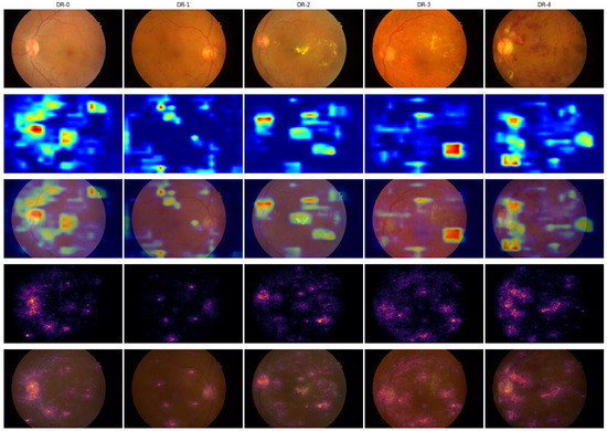 Quellec et al. [36,49] modified CAM to produce heatmaps. Wang et al. [37] proposed Regression Activation Maps (RAMs), an updated version of CAM, to generate heatmaps. They provided evidence that their proposed RAM learned to highlight DR severity-specific signs, such as the narrowing of the retinal arteries for mild-conditioned DR patients and balloon-like structures for severe DR. Gao et al. [40] also utilized CAM to generate heatmaps. They provided evidence that their model focused on primary lesions during classification by providing heatmaps for fundus images affected by severe DR and PDR (Figure 6 in [40]). However, they did not provide any evidence for mild DR or moderate DR. Therefore, it is unclear where their ADRCs focused during decision-making.