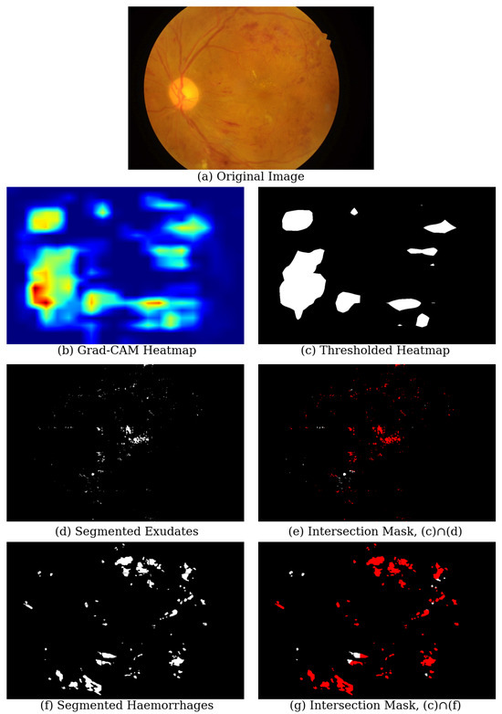 - We automatically determined, with the aid of segmented masks and heatmaps, which parts of the fundus images played a crucial role in the final DR-level detection. For this, we first extracted the areas where XAI technique-generated heatmaps had the highest activation. Next, we performed a pixel-wise logical “AND” operation between these high-activation regions, obtained by applying percentile-based thresholding to the heatmaps and the corresponding binary masks generated by our segmentation models. After that, we determined the overlapped area between the model’s predicted regions of interest and the actual pathological areas. Formally, for each image i, we define the following: