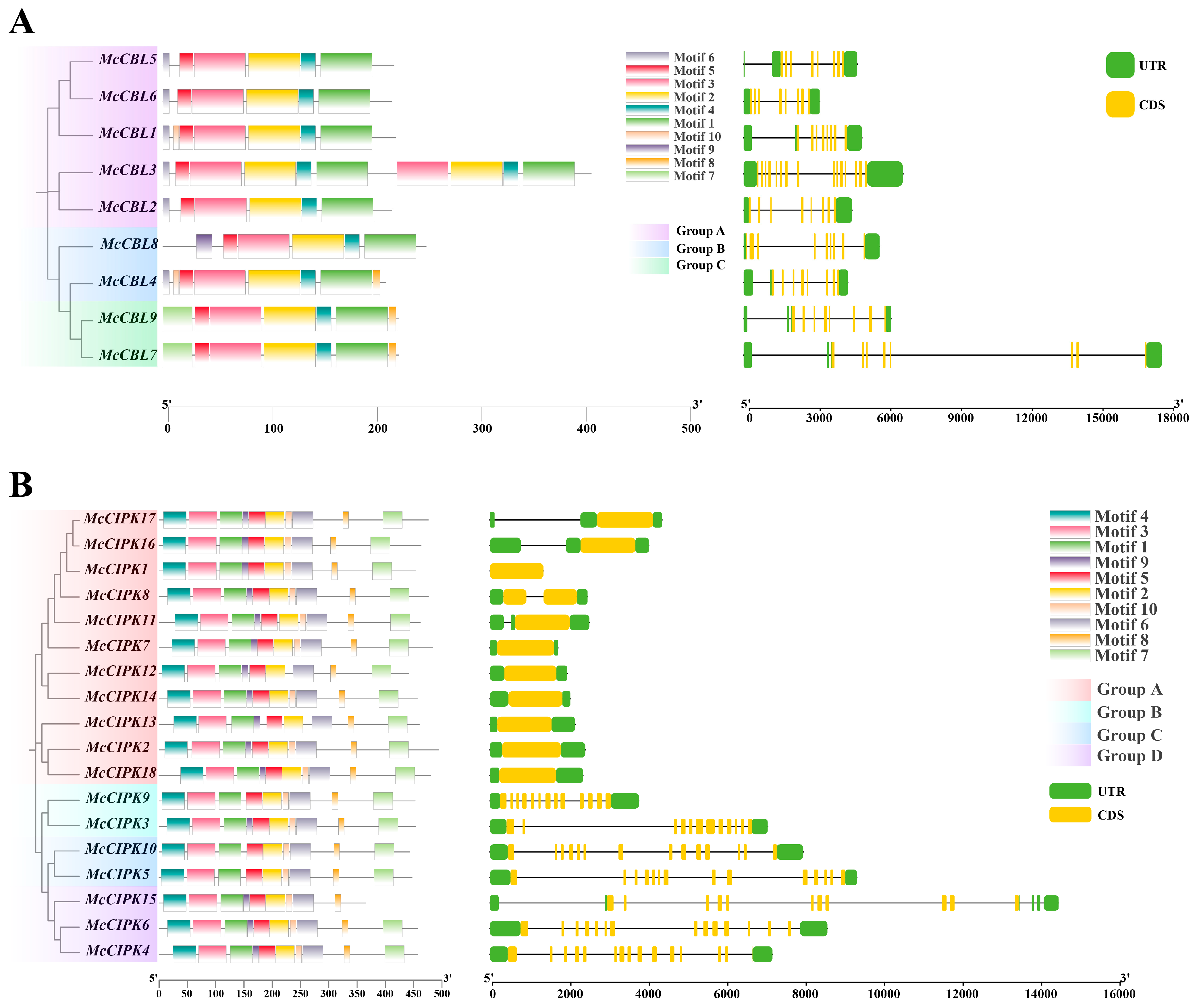2.3. Analysis of Conserved Domains, Motifs, and Gene Structure of CBL-CIPK Gene Family Members