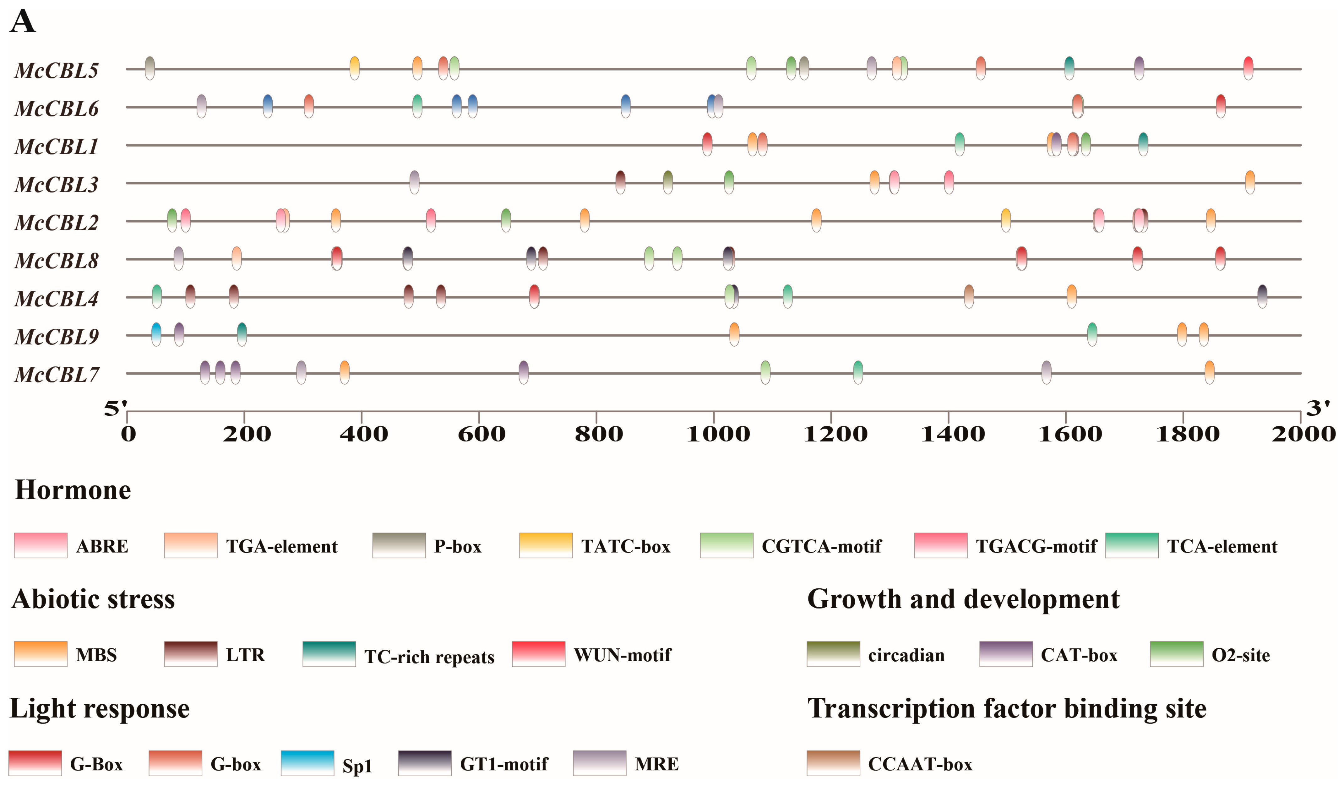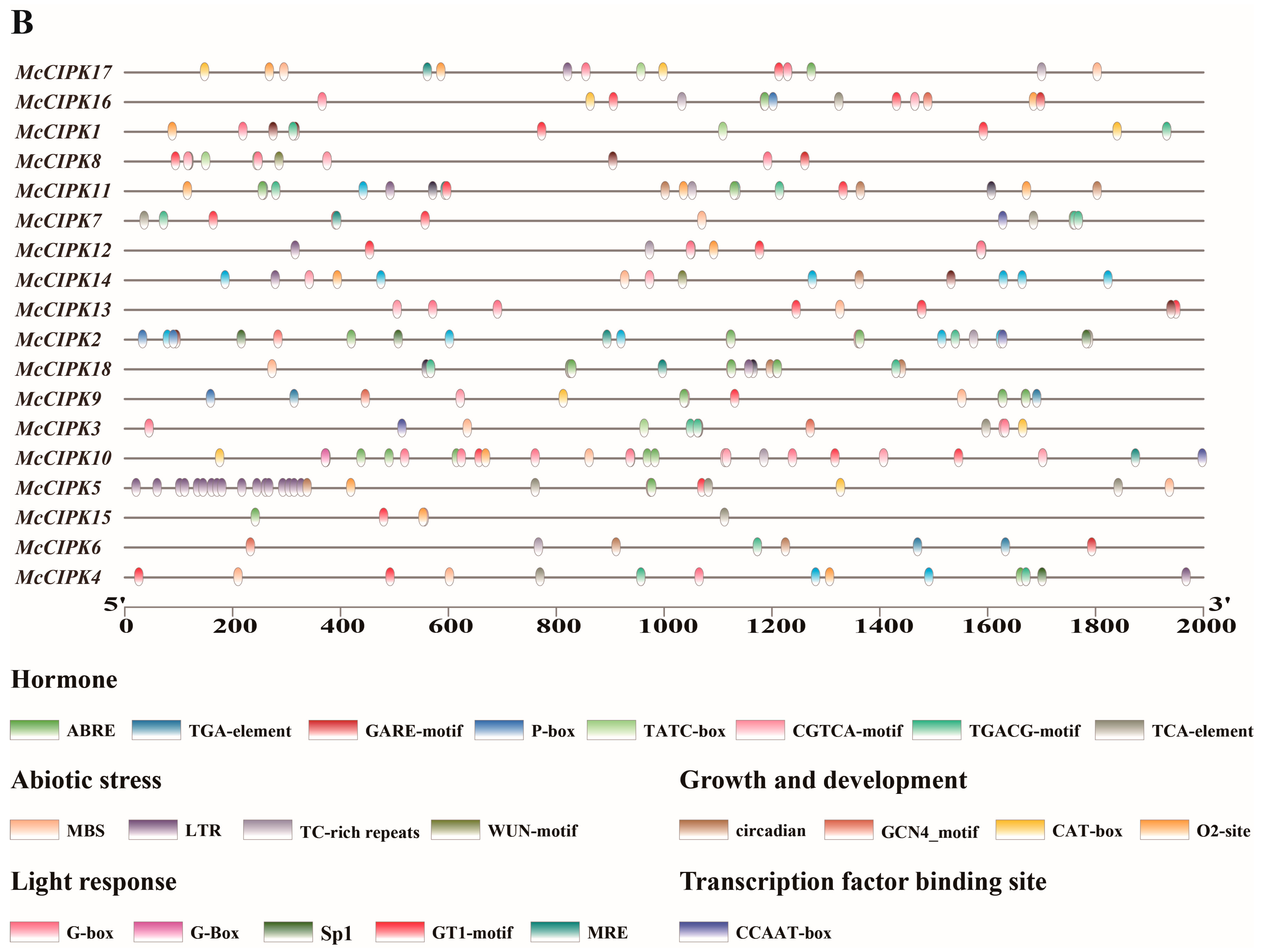 3.5. Analysis of Cis-Acting Regulatory Elements in Ice Plant CBL-CIPK Gene Family Members