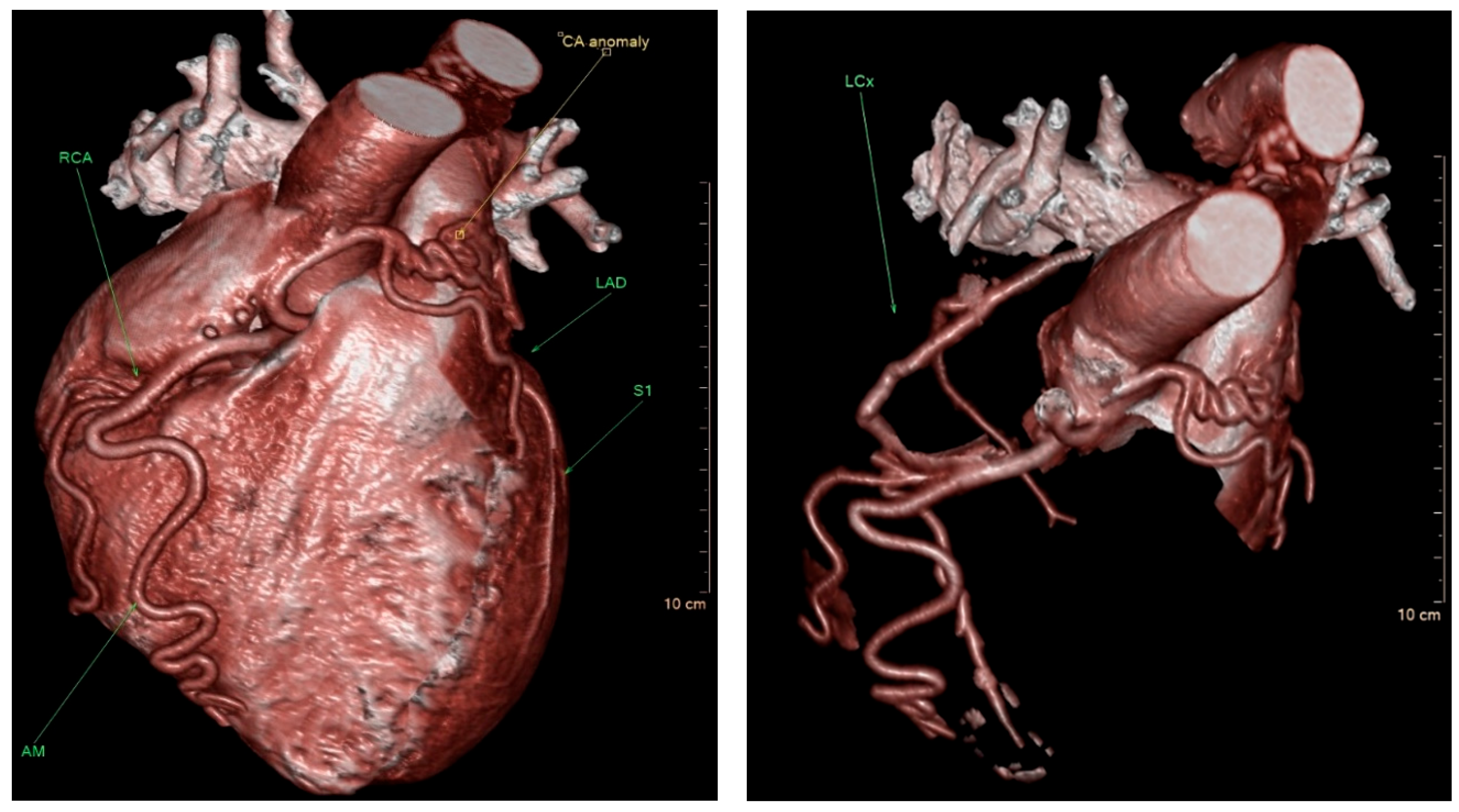 Figure 1). Given the patient’s persistent symptoms and the angiographic findings, further evaluation was pursued. Multidetector computed tomography (MDCT) of the heart was performed, which confirmed the diagnosis of ALCAPA. The MDCT demonstrated coronary arteries originating from the RCC, including the left anterior descending coronary artery (LAD) with a coronary–pulmonary artery (PA) fistula, and an anomalous origin of the left circumflex (LCx) coronary artery from the right pulmonary artery (RPA) (