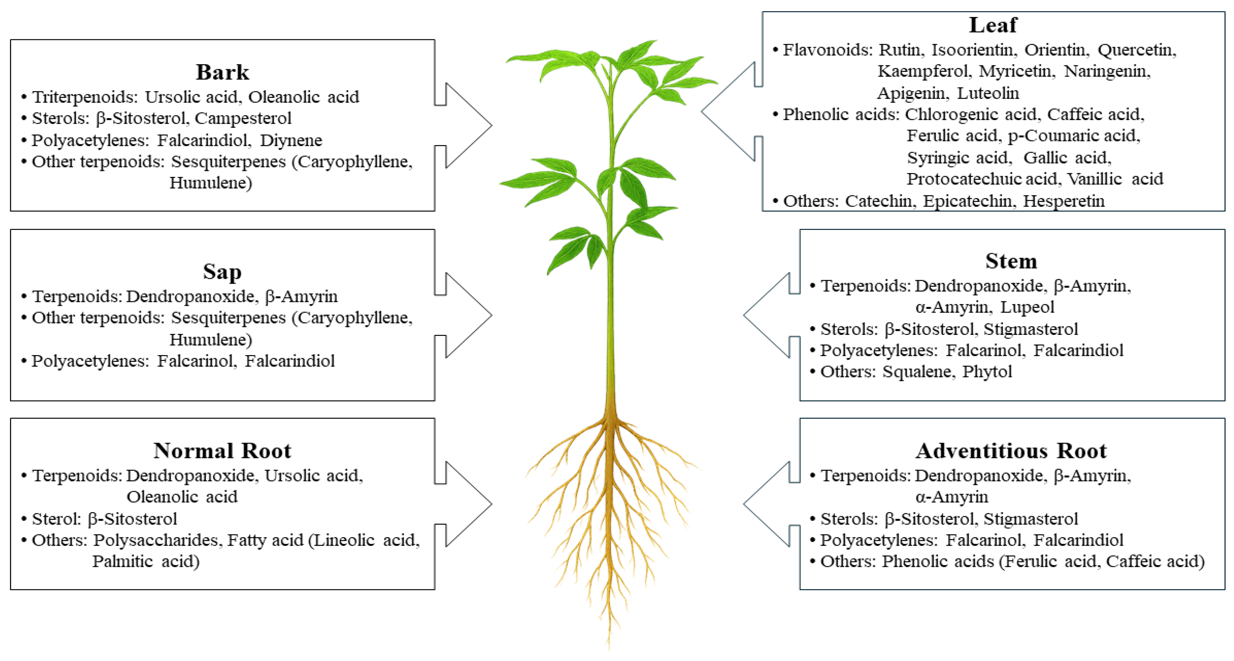 | Polyacetylenes (falcarinol derivatives) | 80% MeOH → liquid–liquid partitioning (hexane, CHCl3, ethyl acetate (EtOAc)) | Maceration (48 h); vacuum concentration | Bark | Charged aerosol detector (CAD) or MS detection |