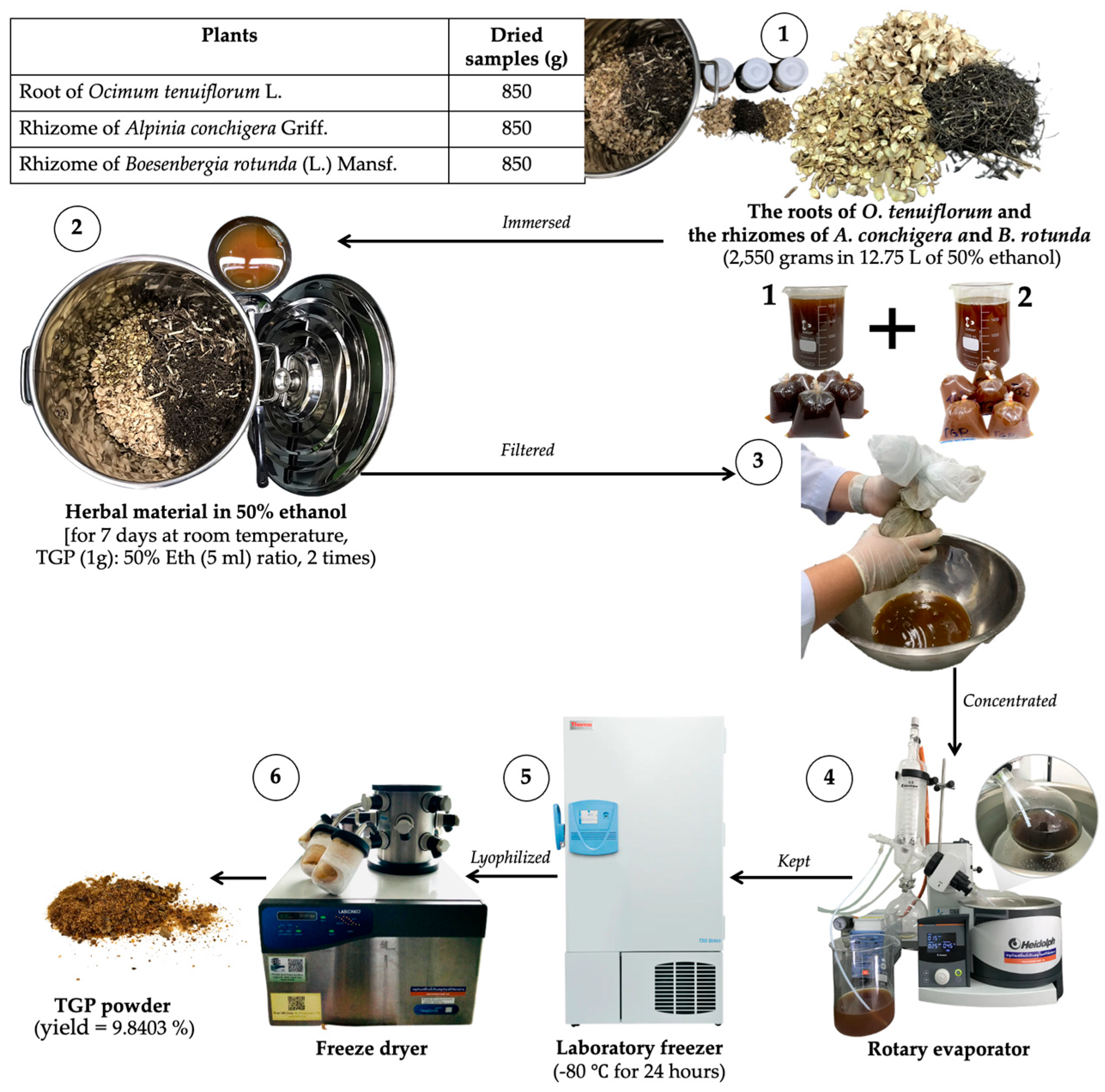 2.2. Tri Garn Pis (TGP) Recipe Preparation and Extraction